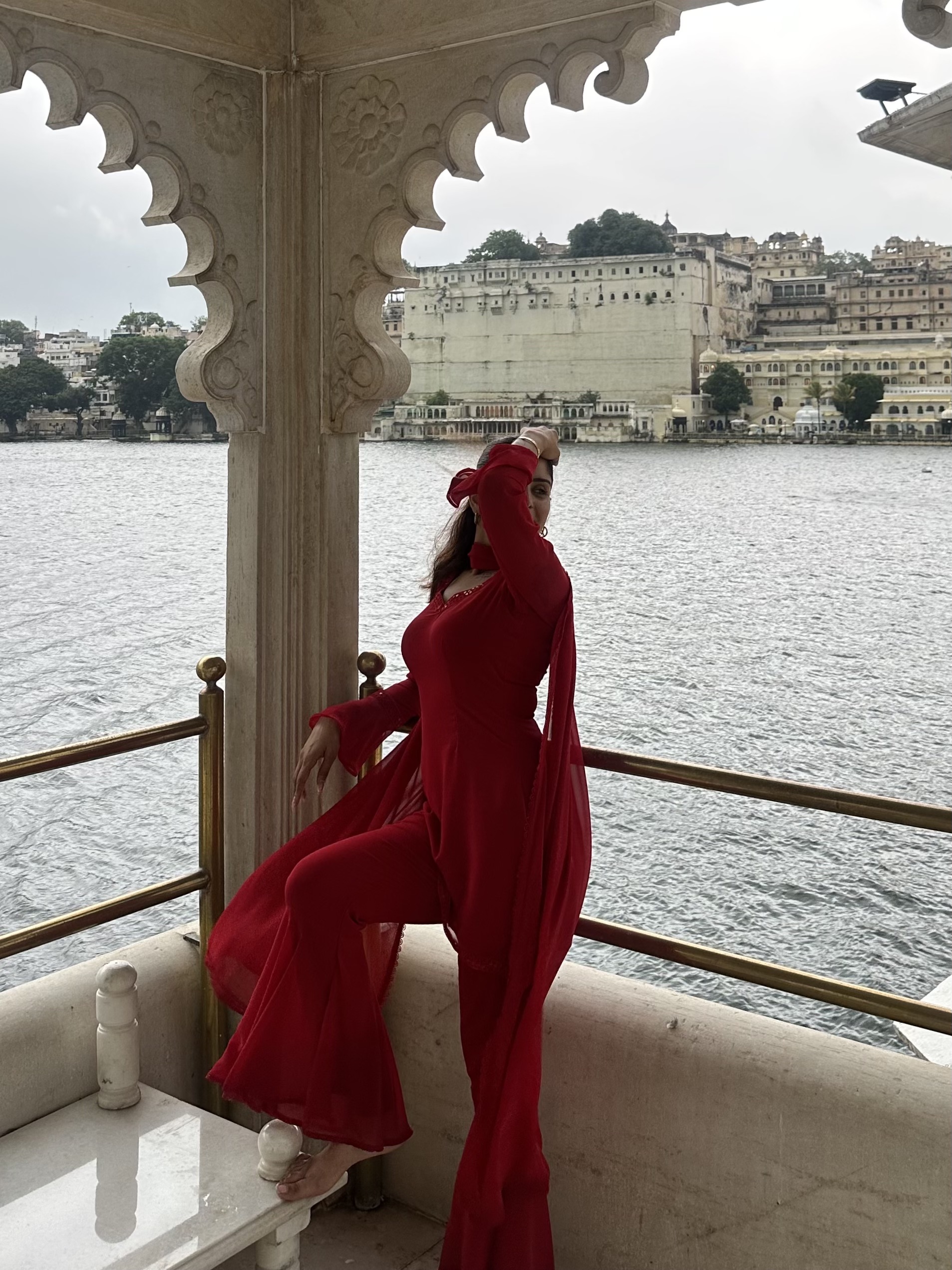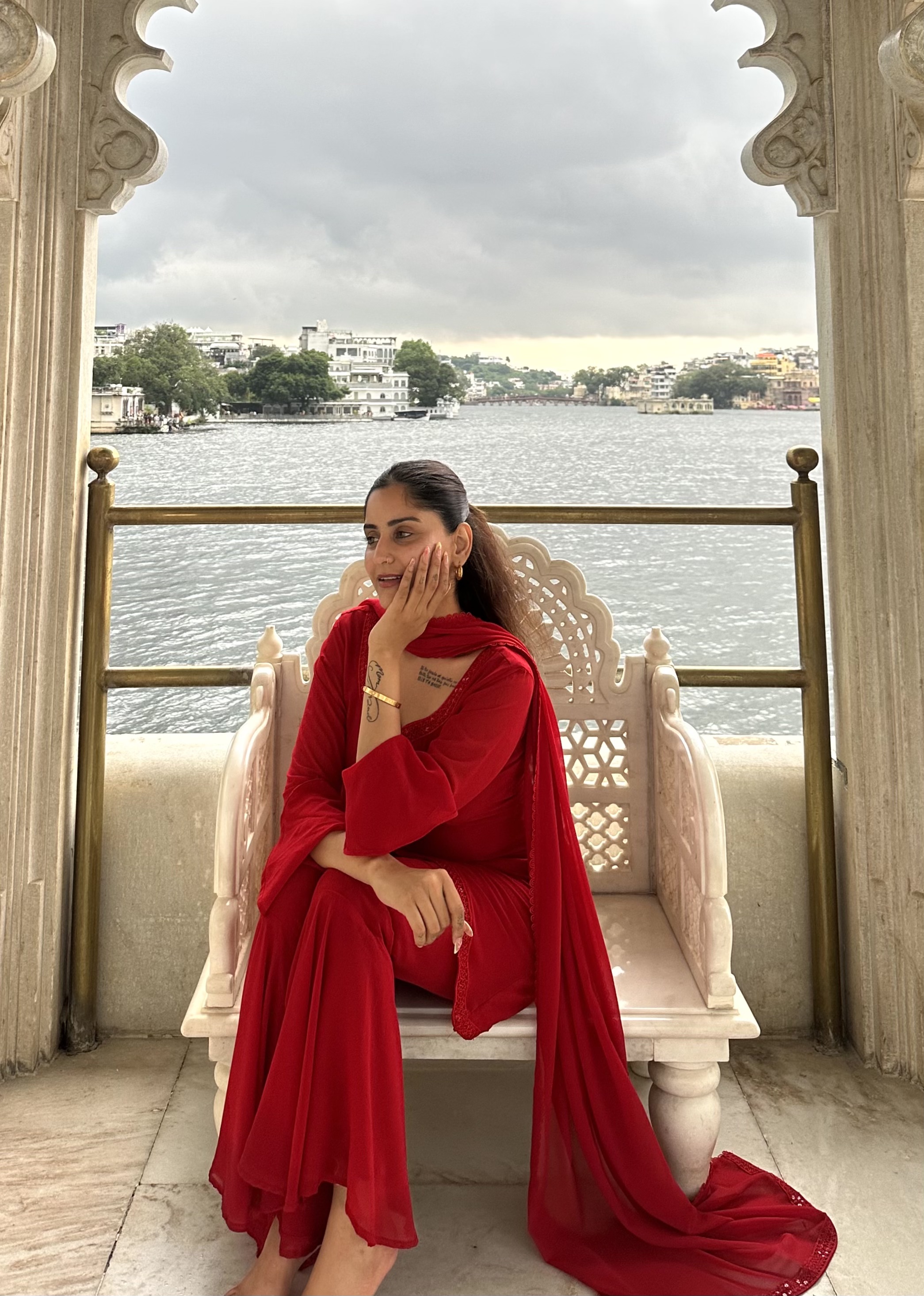 Simplicity meets allure in our Scarlet Grace Kurta Set, a classic red ensemble designed for effortless elegance. The rich scarlet hue embodies confidence and femininity, while the lightweight fabric flows gracefully with every move. Featuring sheer flared sleeves and a delicately finished hemline, this set strikes the perfect balance between modern minimalism and traditional charm. Paired with a matching dupatta and tapered bottoms, it’s ideal for festive evenings, cultural events, or daytime celebrations by the lake. Subtle yet striking, this piece celebrates timeless Indian craftsmanship in a contemporary silhouette. Key Features: • Fabric: Soft georgette or chiffon blend • Color: Deep scarlet red • Includes: Kurta, bottom, and matching dupatta • Sheer frilled sleeves with elegant detailing • Lightweight and breathable • Ideal for festivities, celebrations, and elegant daywear Care Instructions: Dry clean or gentle hand wash. Hang to dry. Avoid direct sunlight.