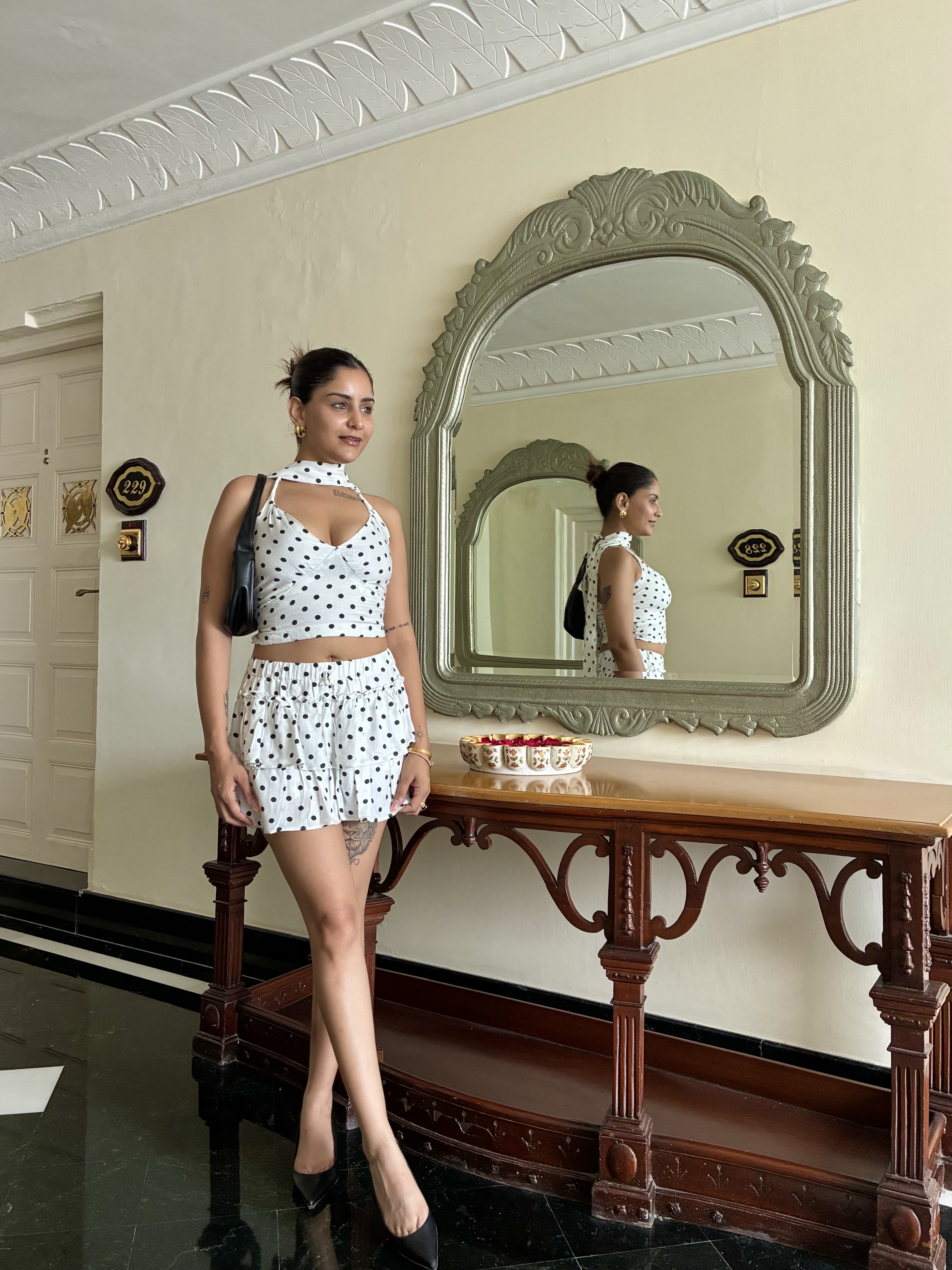 Step into playful sophistication with our Polka Charm Co-Ord Set, a modern take on classic vintage elegance. Designed in a crisp white base adorned with timeless black polka dots, this flirty two-piece ensemble features a fitted halter-neck top with a tie-back detail and a matching high-waist flared mini skirt. The silhouette exudes youthful confidence and effortless style — perfect for brunch dates, summer vacations, or rooftop soirées. Crafted from soft, breathable fabric, it’s as comfortable as it is chic, letting you move with grace and confidence. Key Features: • Fabric: Lightweight crepe or cotton blend • Color: White with black polka dots • Includes: Crop top and flared mini skirt • Halter-neck tie detail with backless finish • Playful yet elegant design for all-day wear • Ideal for brunch, holidays, or casual evening events Care Instructions: Machine wash cold or gentle hand wash. Hang to dry. Iron on low heat.